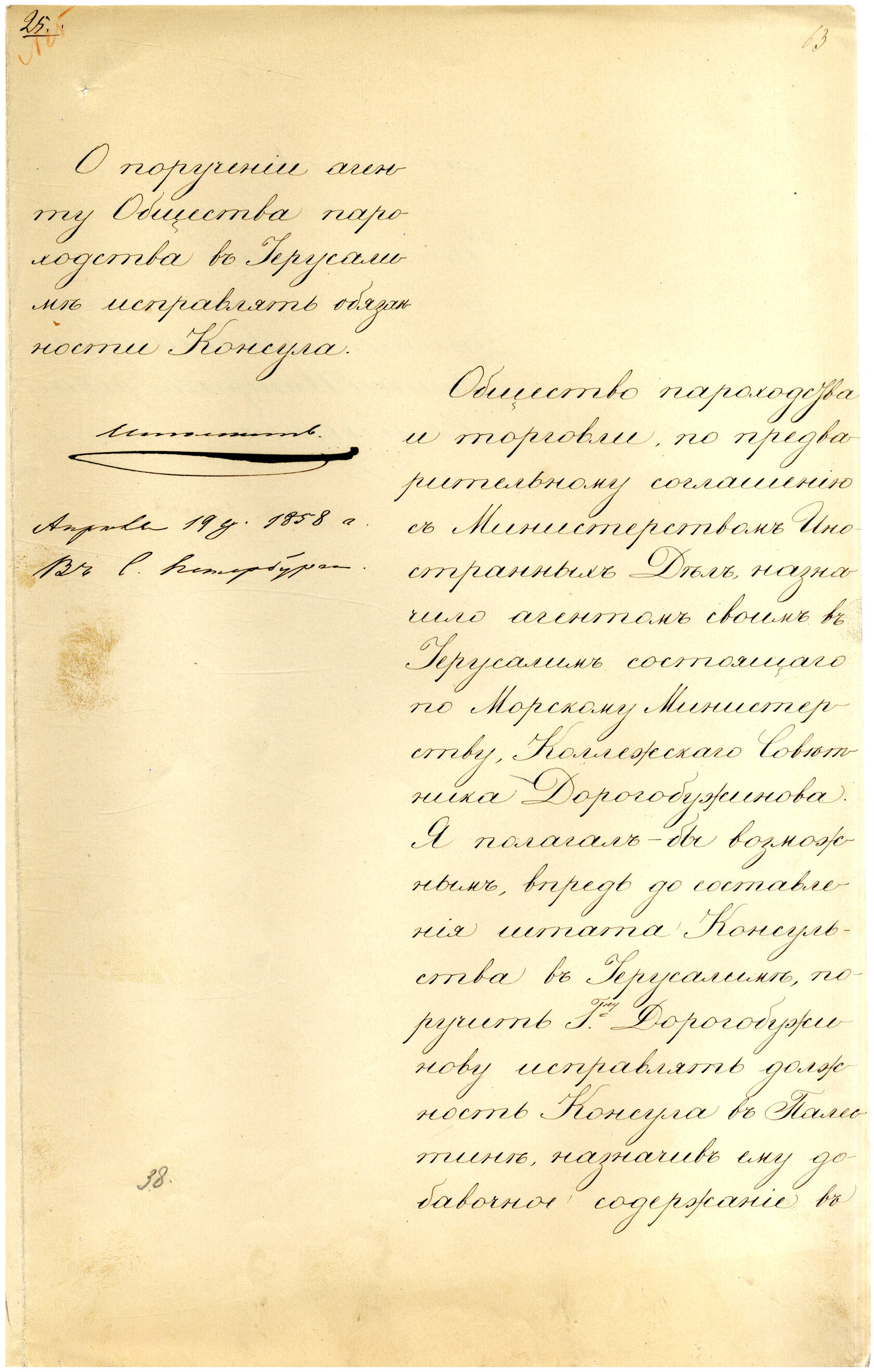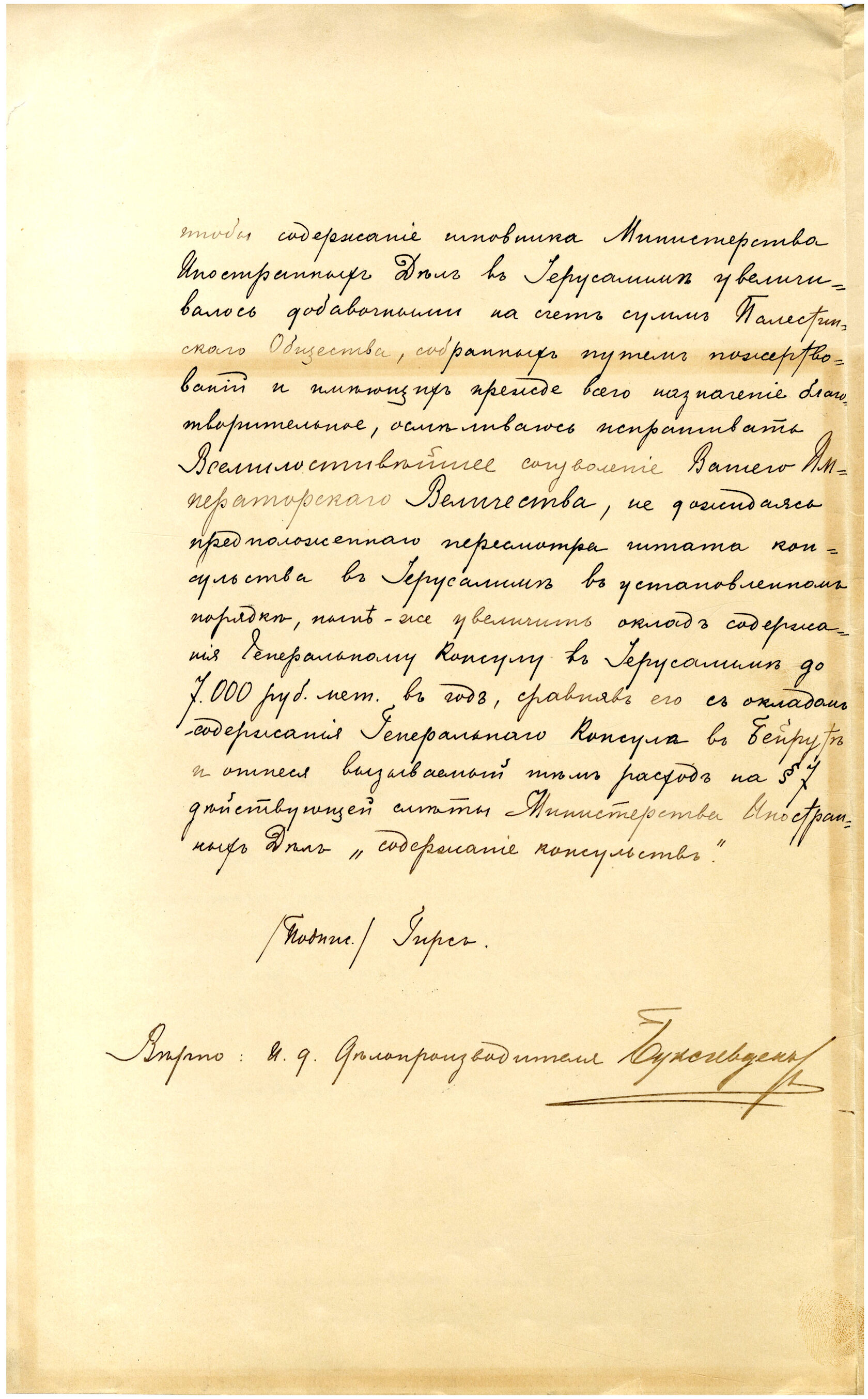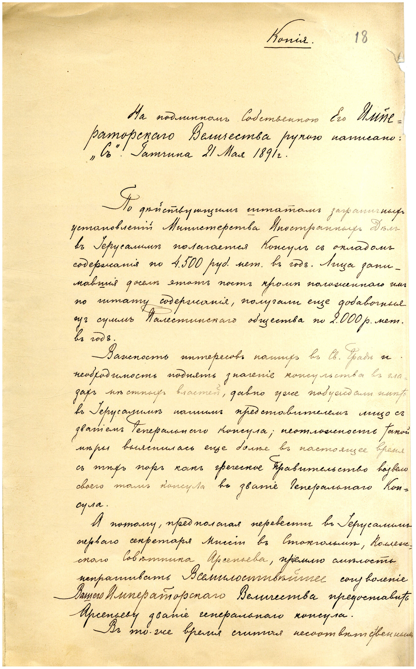 Доклад Н.К.Гирса императору Александру III о необходимости повысить уровень представительства России в Иерусалиме. Помета на документе: «На подлинном собственной Его Императорского Величества рукой написано: «Съ» (Согласен). Гатчина, 21 мая 1891 г.».
