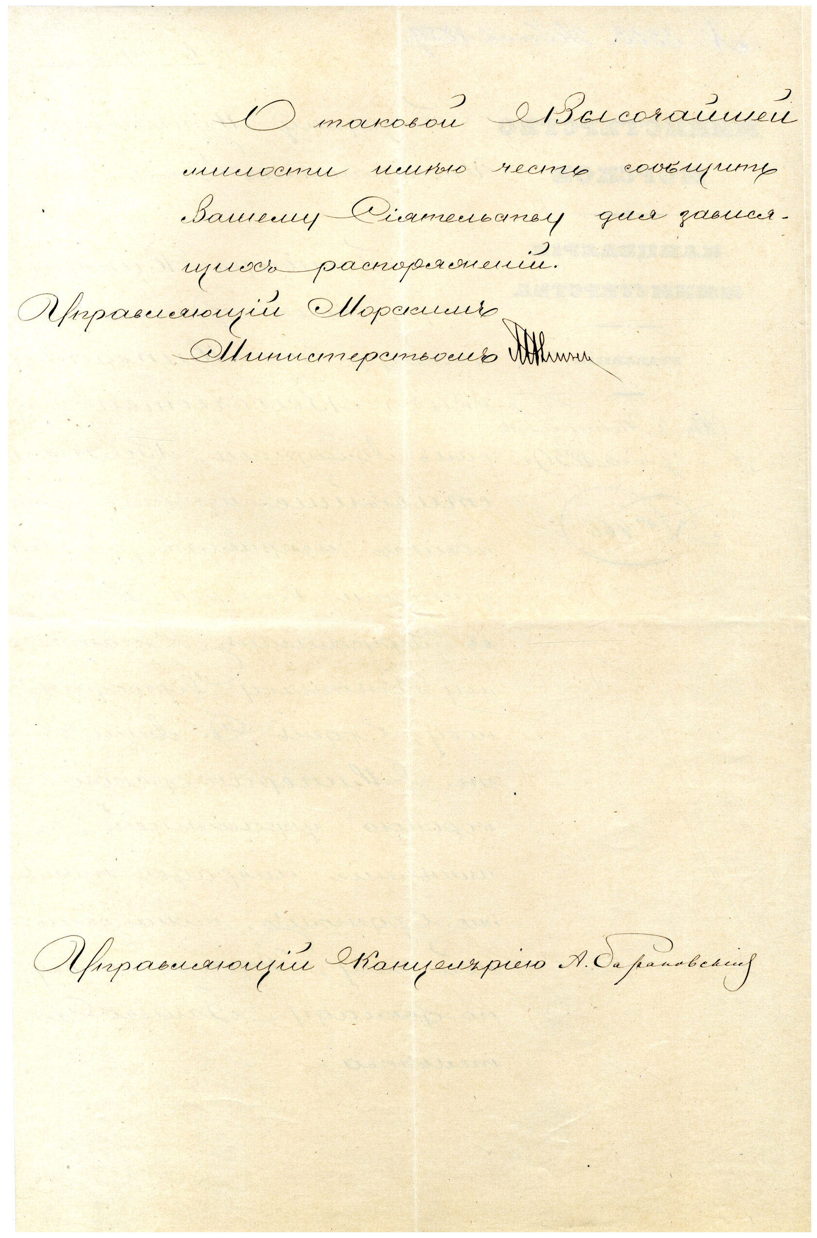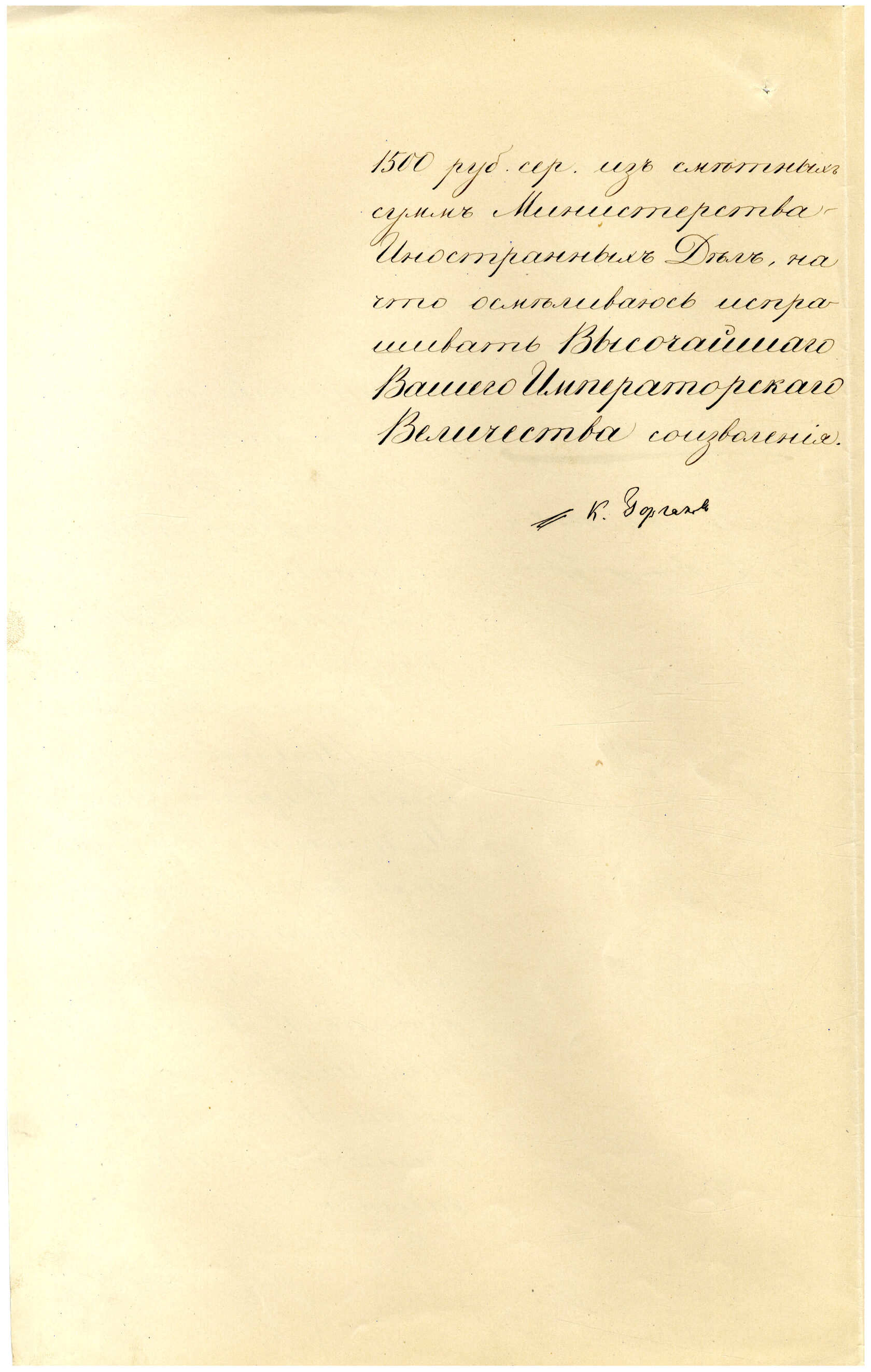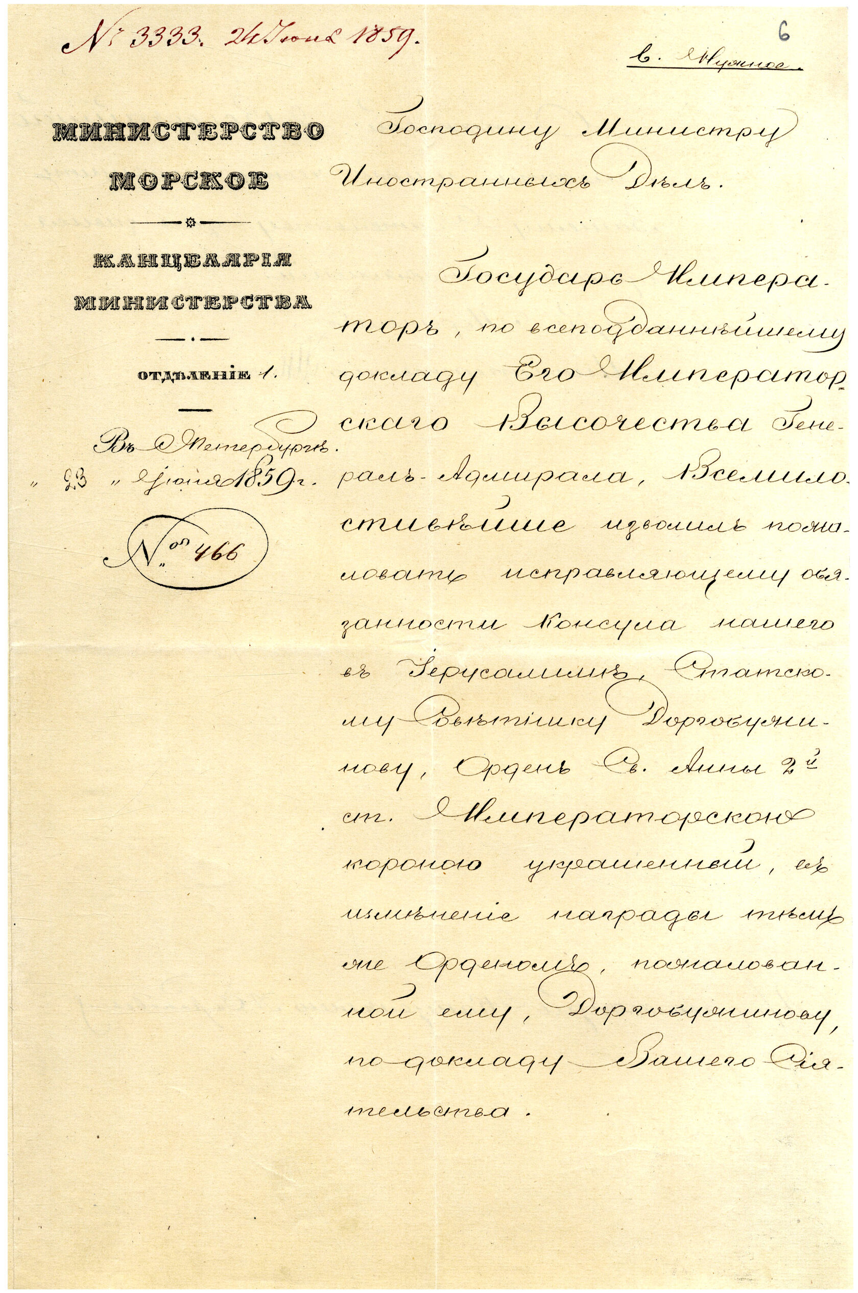 Доклад Н.К.Гирса императору Александру III о необходимости повысить уровень представительства России в Иерусалиме. Помета на документе: «На подлинном собственной Его Императорского Величества рукой написано: «Съ» (Согласен). Гатчина, 21 мая 1891 г.».