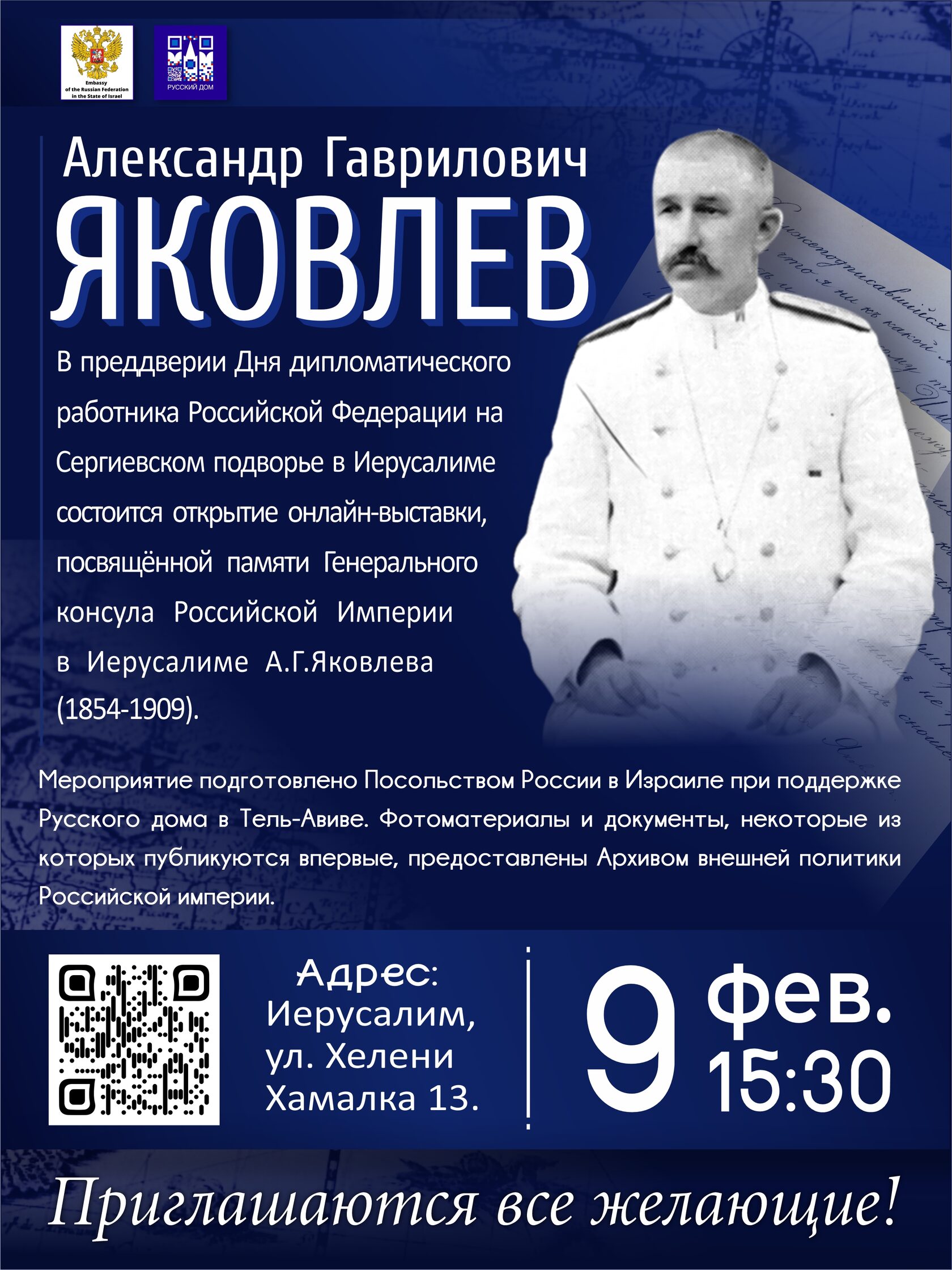 9 февраля 2023 г. на Сергиевском подворье в Иерусалиме в преддверии Дня дипломатического работника Российской Федерации состоялось открытие онлайн-выставки «А. Г. Яковлев. Десять лет на службе Российским Императорским генеральным консулом в Святой земле». В ходе презентации старший дипломат Посольства России в Израиле Ф. В. Георги выступил с ознакомительной лекцией, посвящённой А. Г. Яковлеву и его вкладу в укрепление российского присутствия в Святой земле.